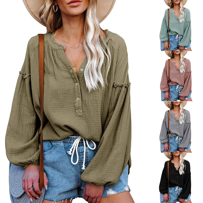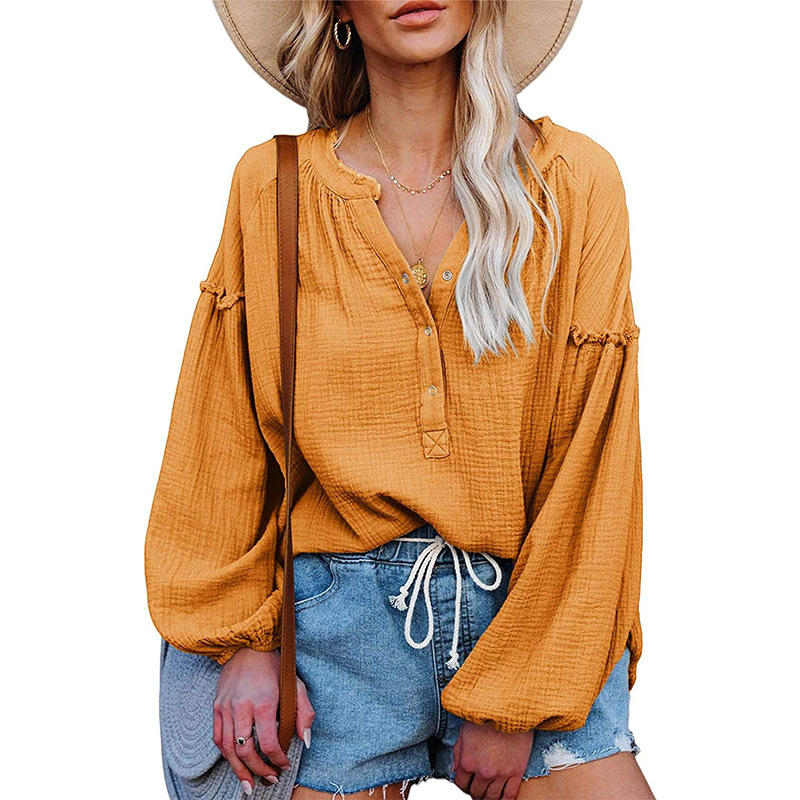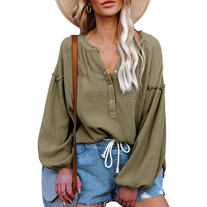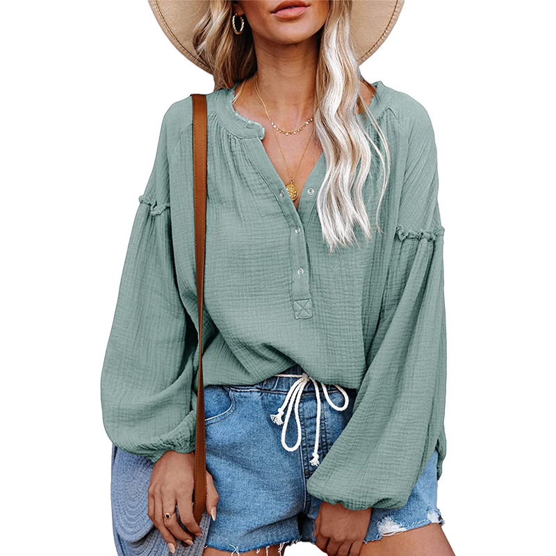 V-neck Lantern Sleeve Cotton Shirt Pullover